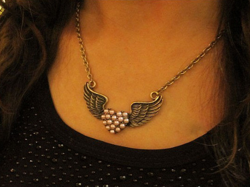 Retro Angel Wings Pink Pearl Heart Pendant Sweater Necklace